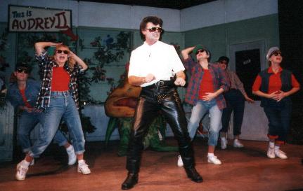 | After Audrey's sadistic dentist boyfriend gets eaten, Seymour has to decide what to do - confess or keep quiet. But thoughts of fame and fortune, plus the chance of having Audrey all to himself, make the decision for him. He has to go on, and so he allows himself to be manipulated by the talking plant until the final climatic finale when .......but that would be telling; see the show. | Dave Morgan as the dentist, and the crystals |